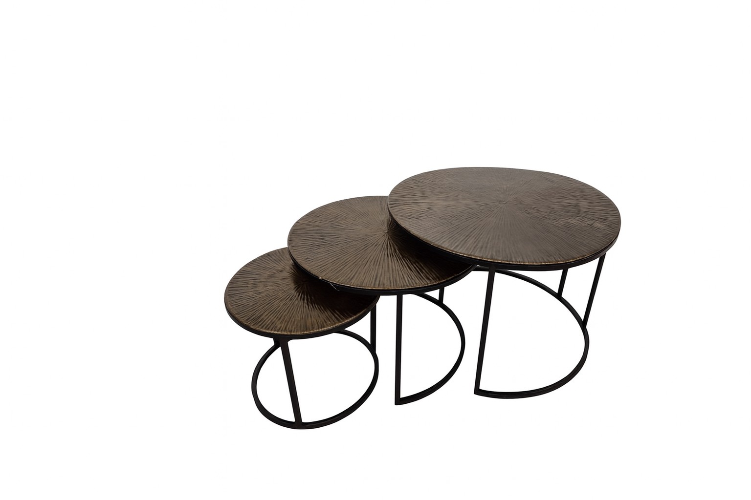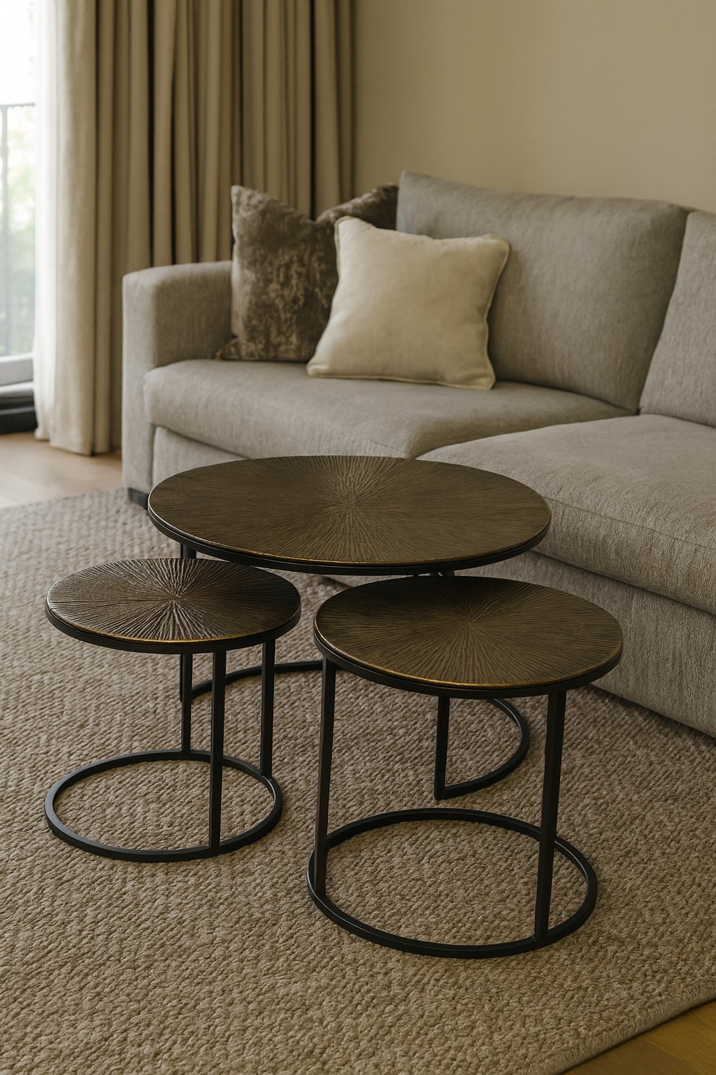 Ontdek de Luxe Rond Bijzettafel Set “Bronze Sun”, een stijlvolle 3-delige tafelset die elegantie en functionaliteit moeiteloos combineert.