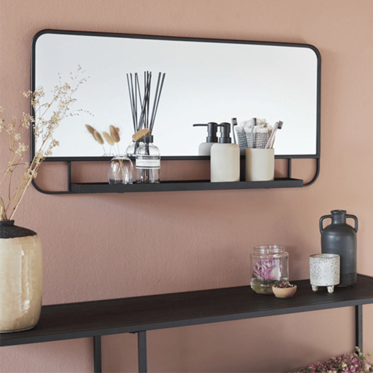 De Lisa wandspiegel combineert een moderne uitstraling met praktische functionaliteit. Het stevige metalen frame zorgt voor een industriële look, terwijl het geïntegreerde plankje onder de spiegel ideaal is voor kleine items zoals sleutels, parfum of decoratie.